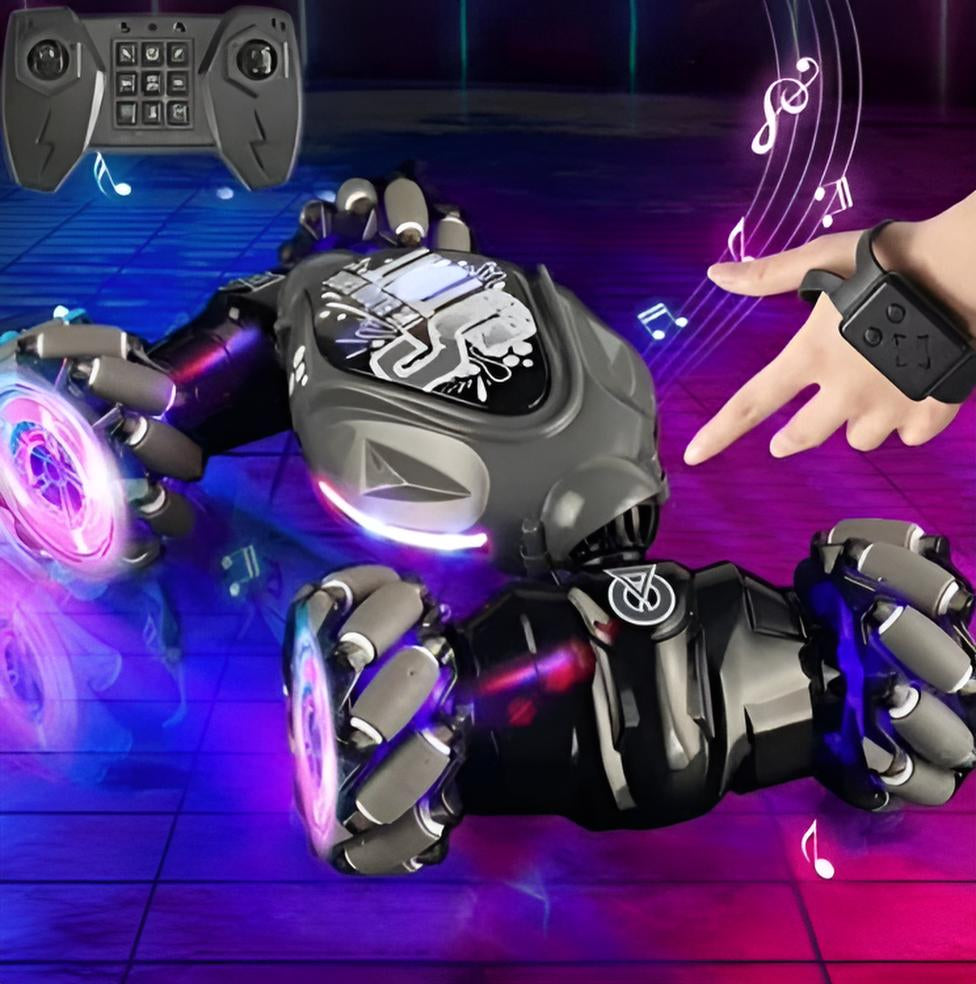 Bērns visu kontrolē tikai ar roku. Mazs sensors, kas piestiprināts pie plaukstas locītavas, nekavējoties reaģē uz kustībām gaisā — rokas pacelšana, pagrieziens vai izteiktāks žests liek auto kustēties, griezties, apmest kūleni vai mainīt virzienu bez nevienas pogas nospiešanas. Bērniem tas šķiet kā īsta superspēja: mašīna paklausa katram kustības signālam un izskatās, it kā to vadītu ar tīru maģiju draugu un ģimenes priekšā.