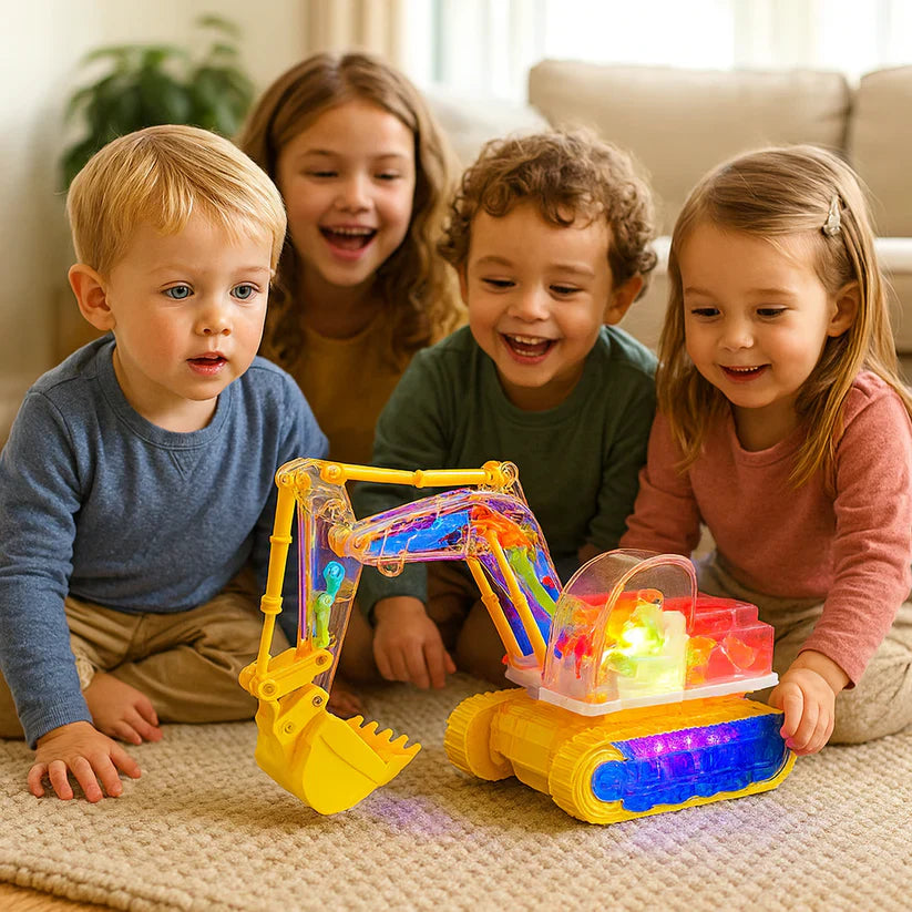 Dejojošs un gaismās mirgojošs muzikālais ekskavators
